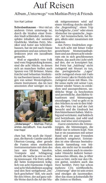 "Jedes Stück auf "unterwegs" ist einem Ort gewidmet, mit dem Mathias Petry intensive private Reiseerlebnisse verbindet - von Regensburg bis Salzburg über Gent und Montpellier bis nach Lagos und dem Green Lake in Florida. In der Fusion aus Jazz, Weltmusik und expreimentellen Klanglandschaften erleben die Hörerinnen und Hörer diese Orte als akustisches Kopfkino."